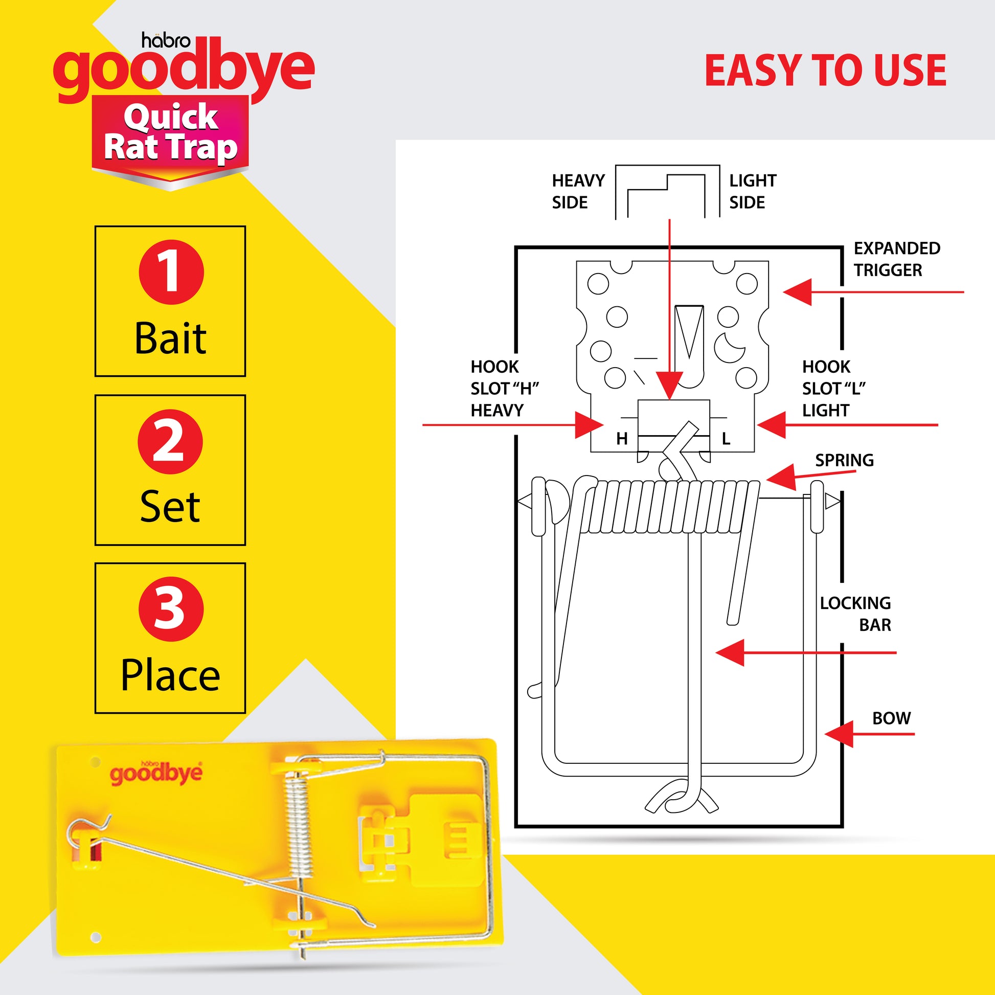 The GOODBYE Mouse Trap Big is engineered for powerful, instant trapping of larger mice and small rats. Designed with a heavy-duty spring-loaded mechanism, this trap delivers maximum performance in one clean snap. Made from durable ABS plastic, it's reusable, hygienic, and built for long-term use. Ideal for kitchens, storage areas, warehouses, and commercial spaces where rodent control is essential.